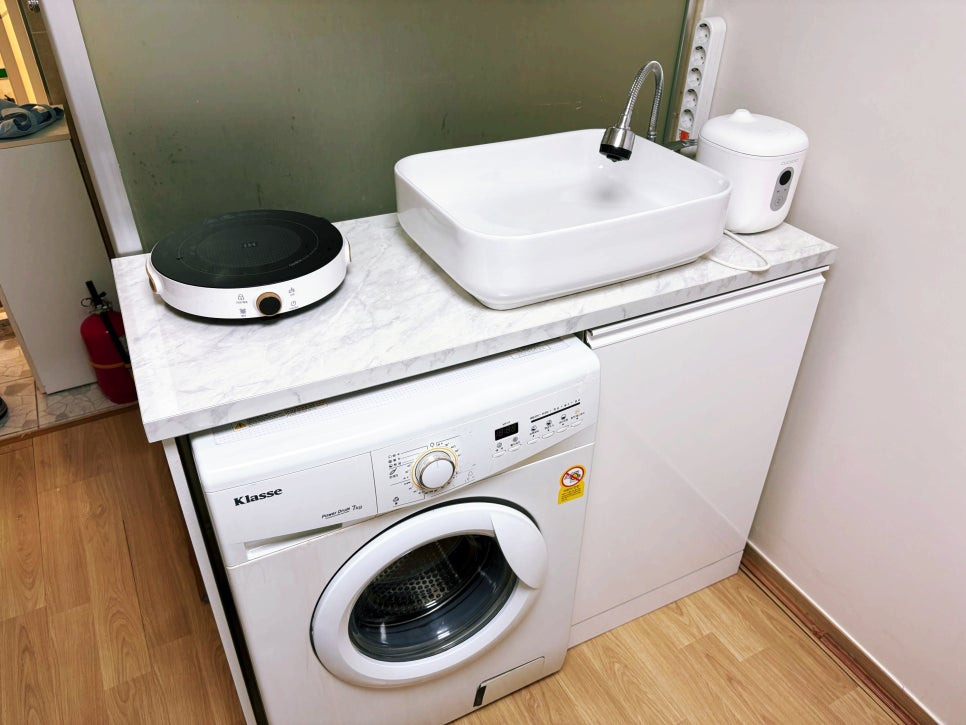 스테이더숲만의 독특한 싱크대가 있으며, 왼쪽에는 간단한 조리가 가능한 인덕션, 그리고 오른쪽에는 1인용 밥솥이 준비되어 있습니다.